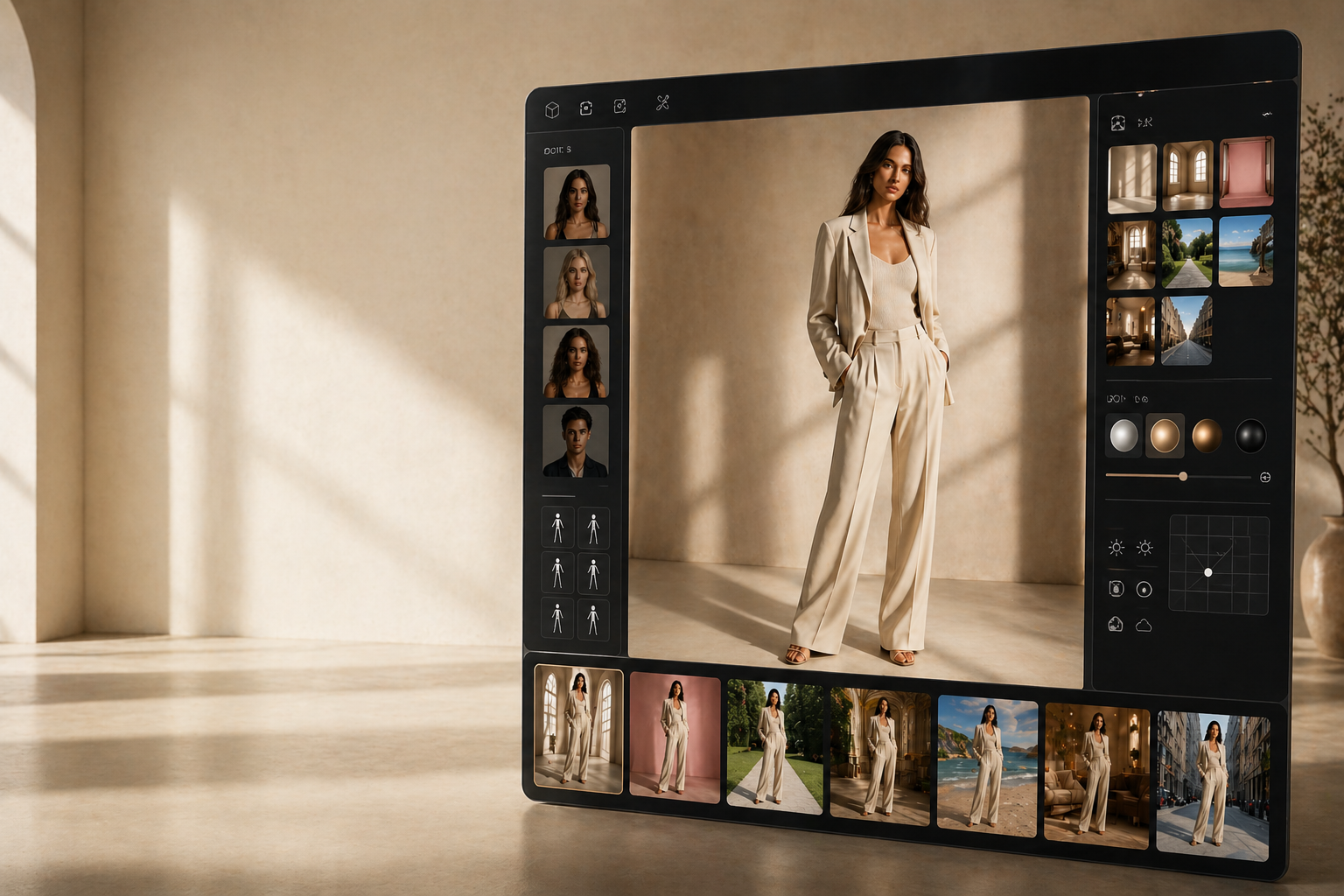STUDIO MODE remplace la pré-production traditionnelle par un studio génératif. Modèles, lumières, décors — composés en quelques secondes, exportés en 4K, sous votre seul contrôle.